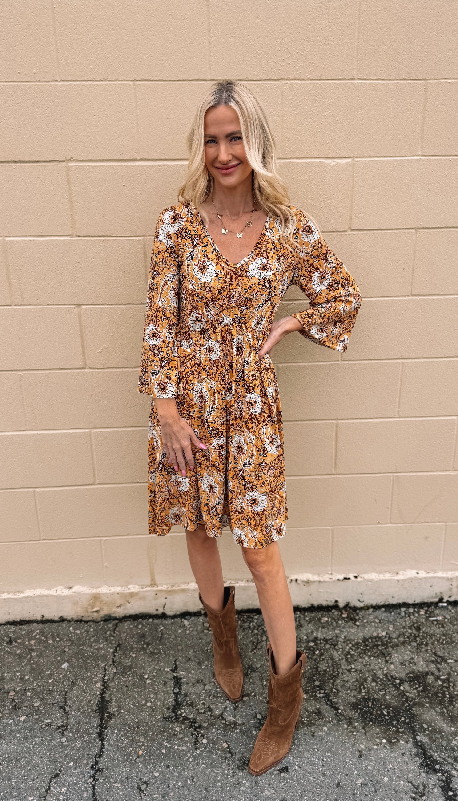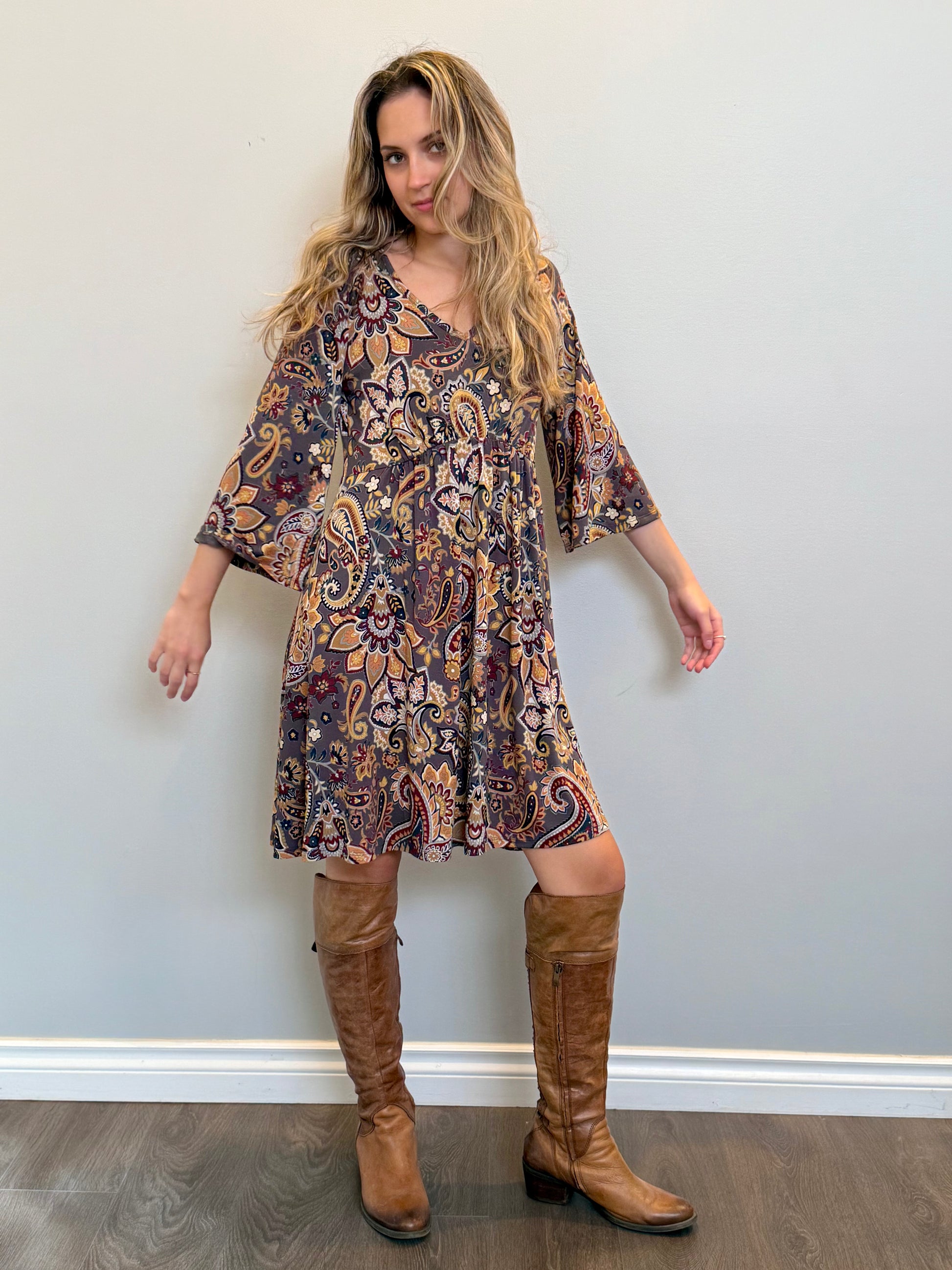 Our Michelle dress has a v-neckline and 3/4 bell sleeves. This dress is done in a relaxed fit, with a flattering empire waist with gathers front and back. The Michelle dress can easily be styled for a casual or dressy look.