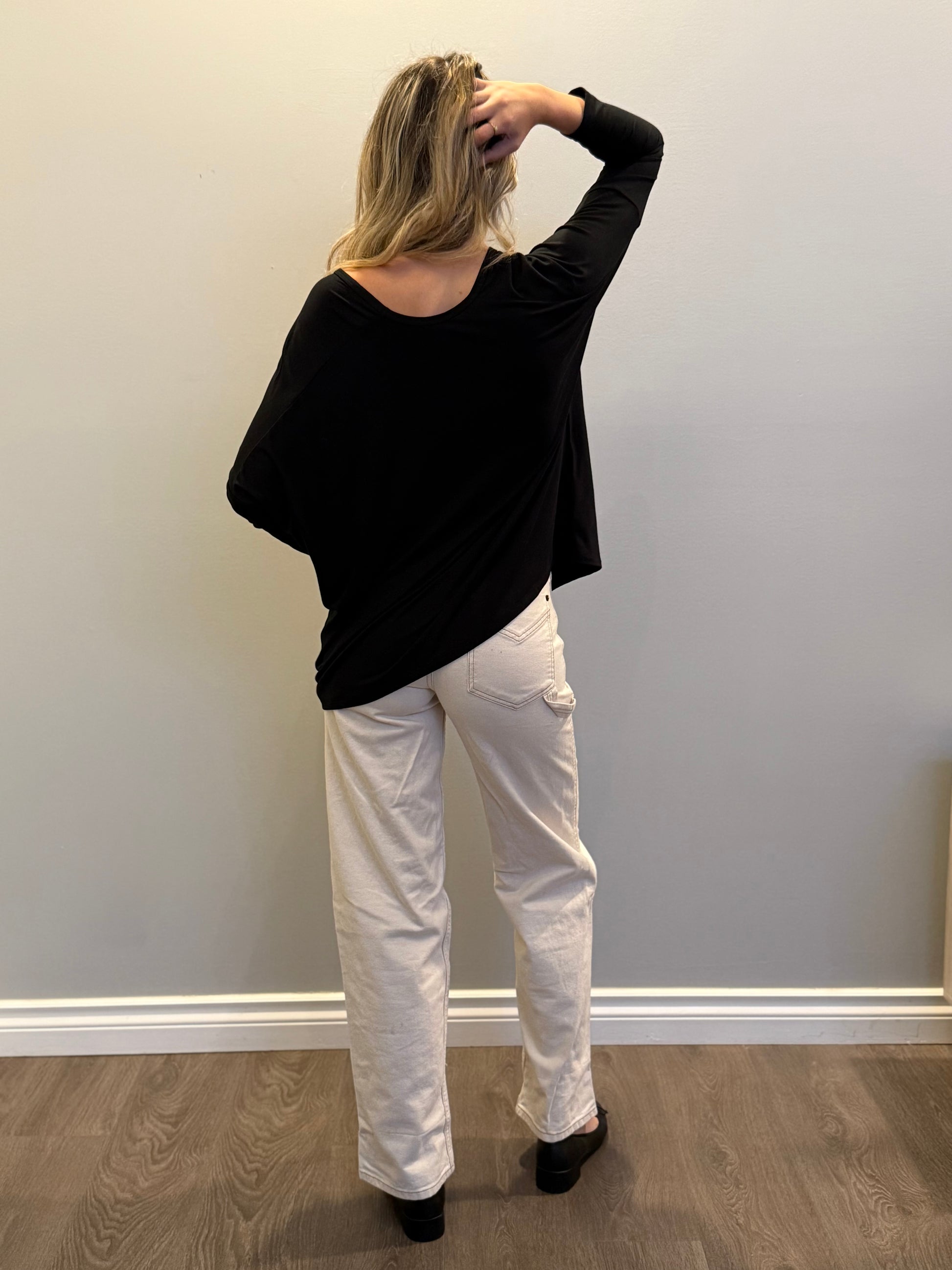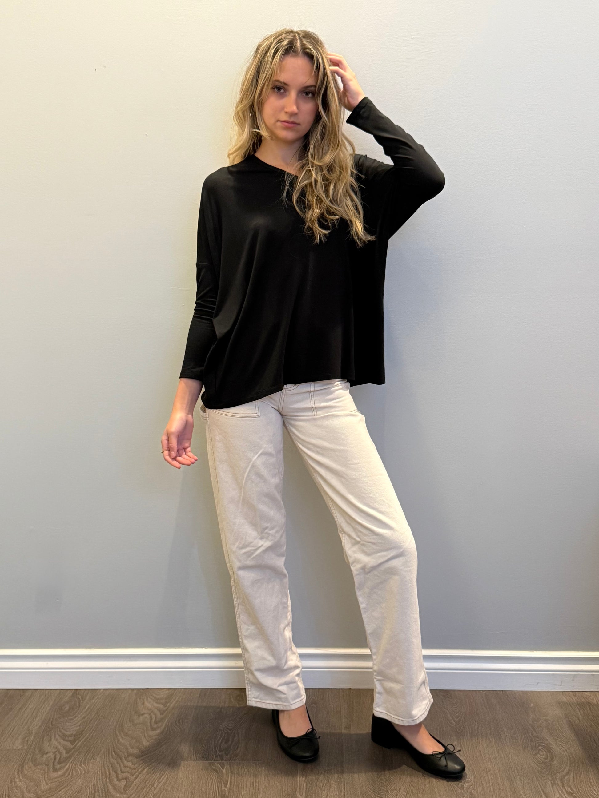 Our Rebecca Top offers a relaxed, loose fit with stylish dolman sleeves and fitted cuffs. The V neckline adds a flattering touch to this effortlessly chic top. Made from our soft OEKO-TEX® certified stretch jersey. We suggest sizing down one size for the best fit.