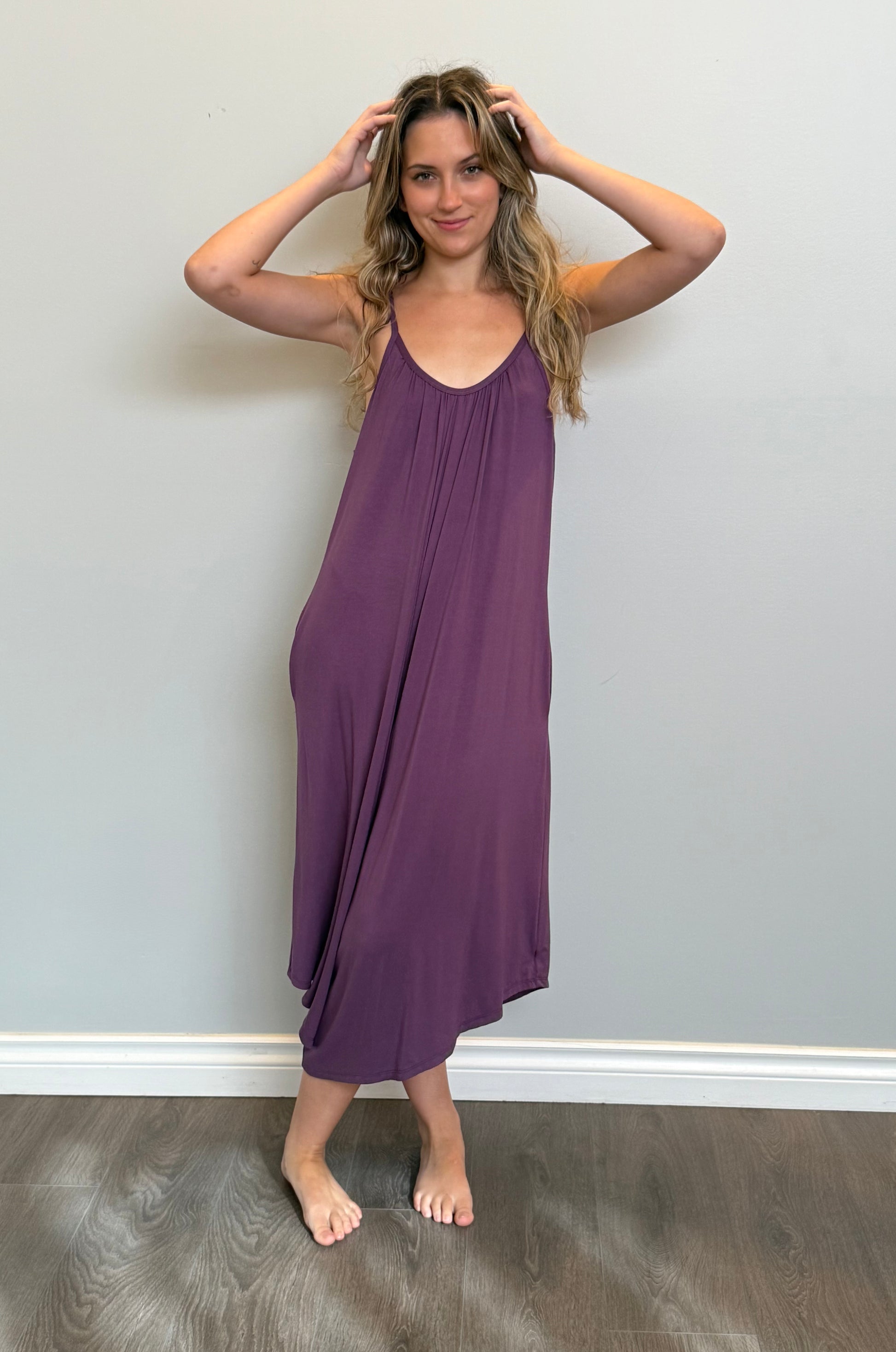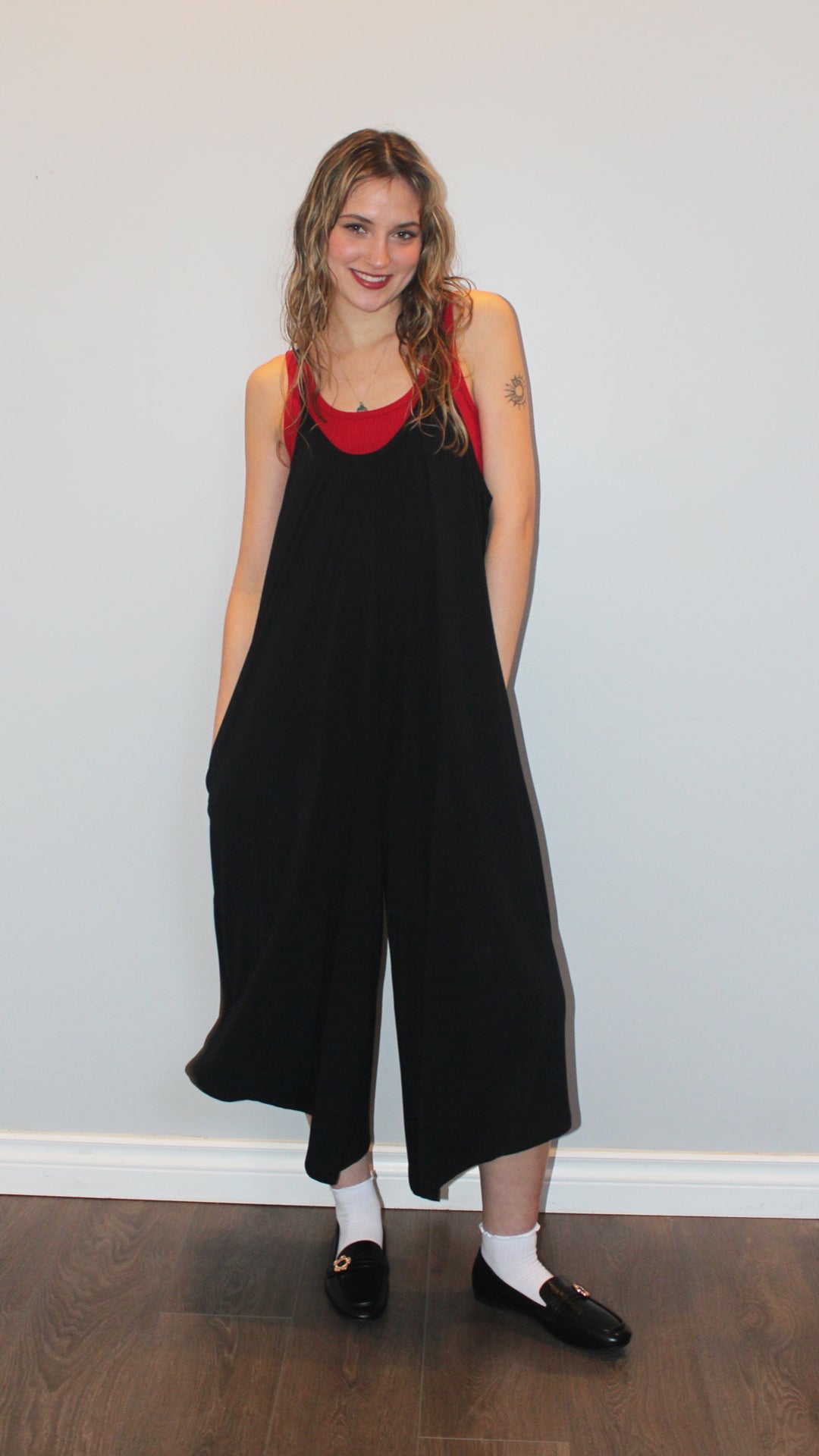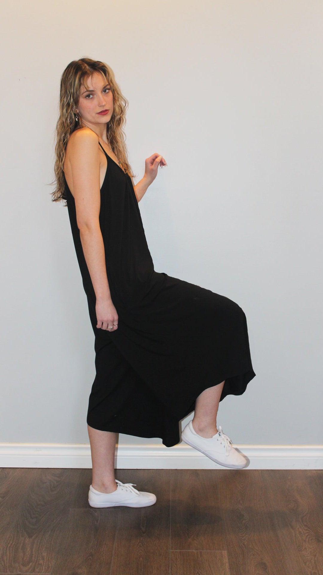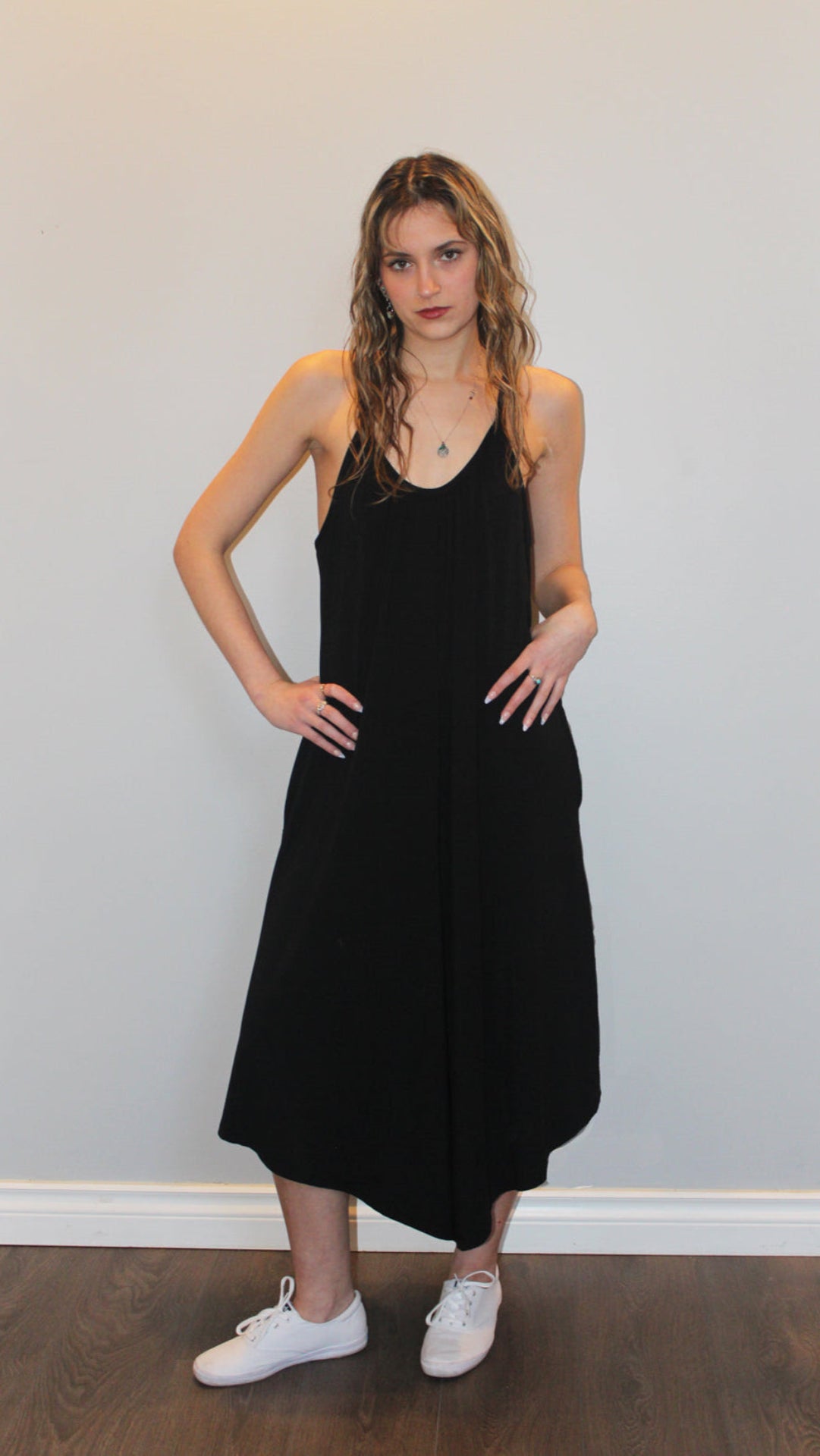 Our Bamboo Jumpsuit is one size. It has a front gathering, scoop neckline, spaghetti straps, side pockets, and a high-low hemline. This is a loose fit jumpsuit. This jumpsuit is ideal for everyday on the go fashion. Our bamboo fabric OEKO-TEX® stretch jersey.